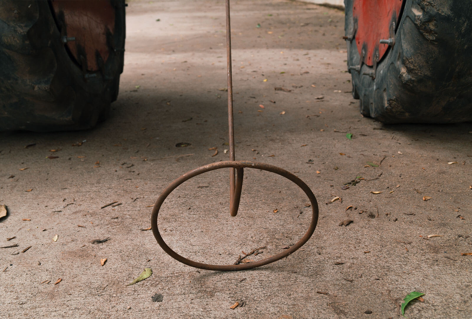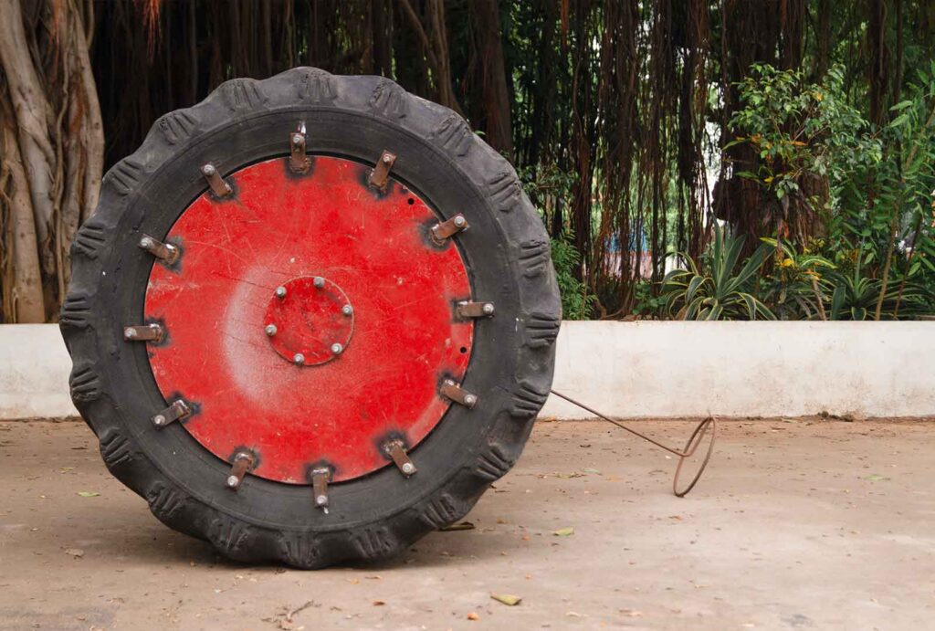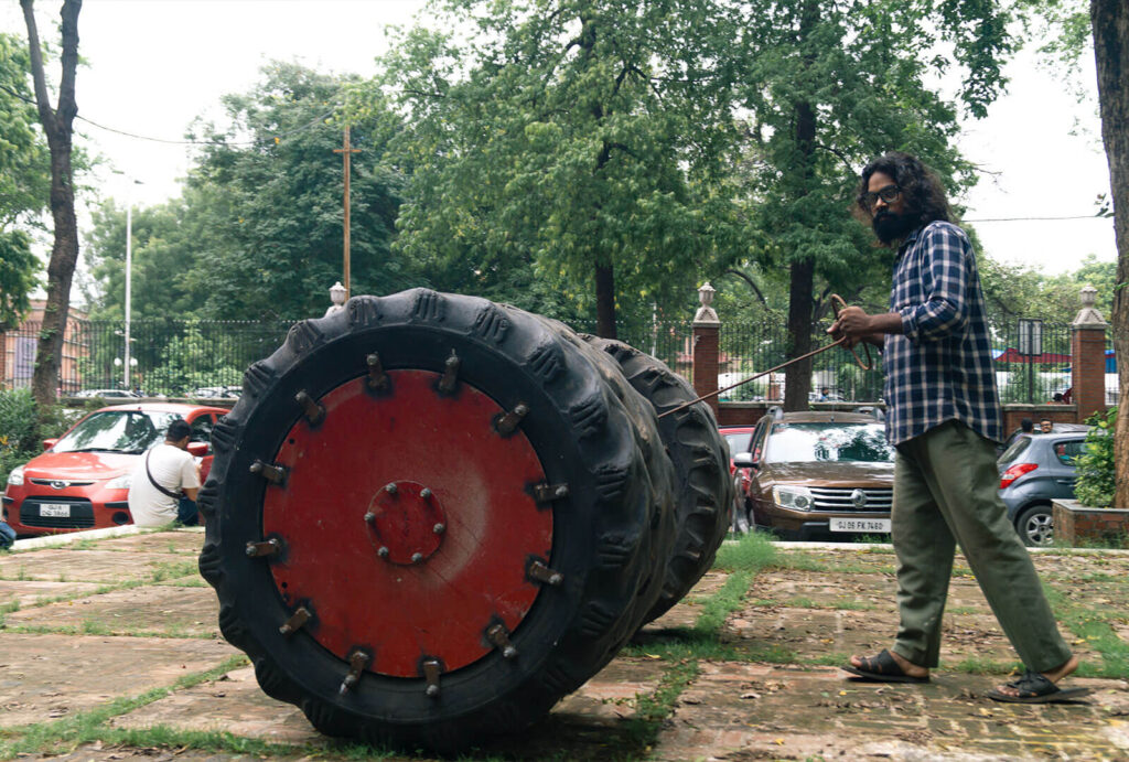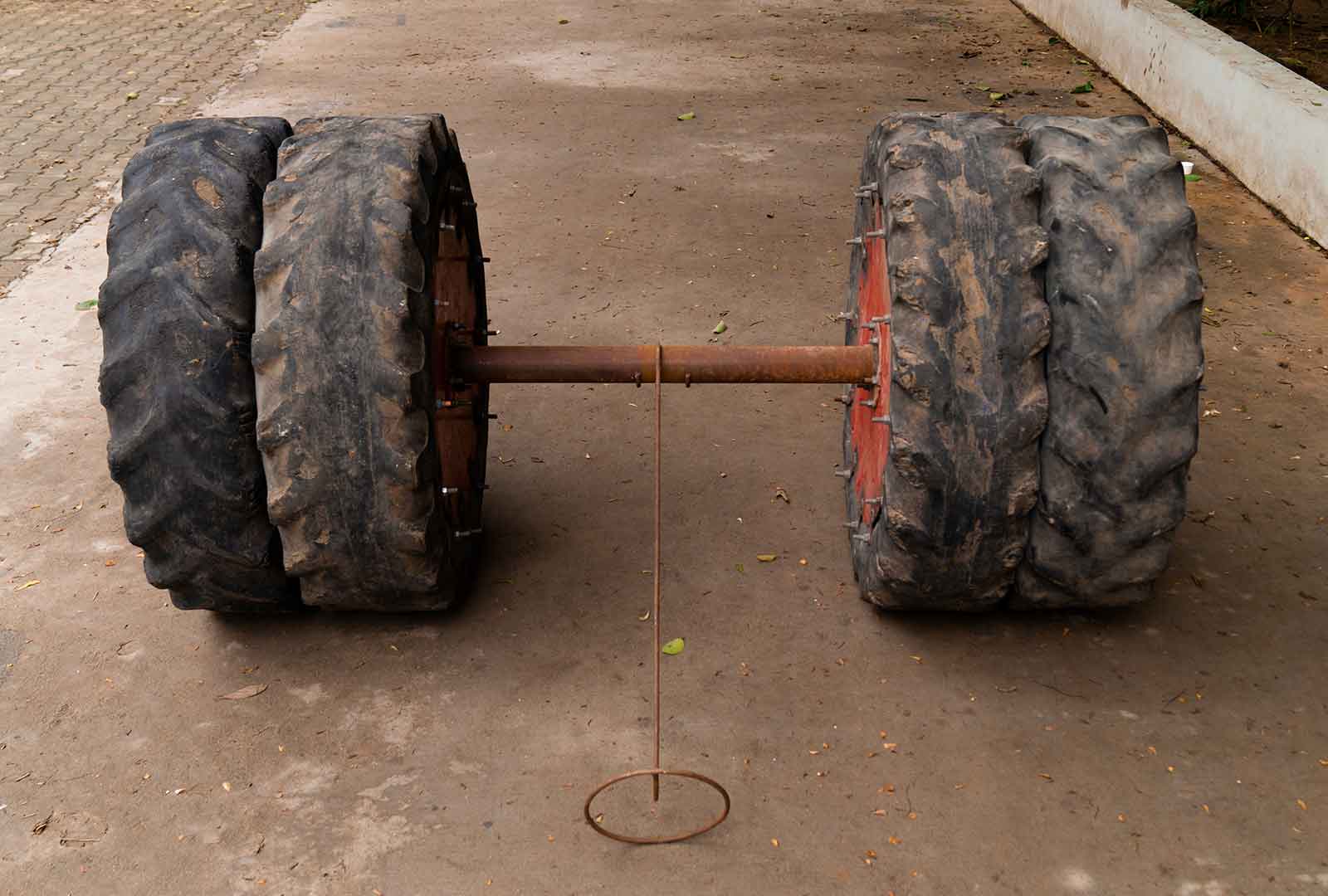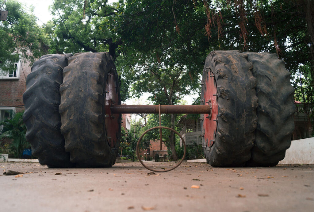 On spiralling around the subject of children’s toys I had an idea of presenting the objects I directly associate with my childhood and are easily recognisable by the viewers. Back in my village, readymade toys are not as popular as they are in the cities. Children there are used to inventing a variety of objects to play with out of which some have similar designs. A very popular kind of toy is made with makeshift material, a cart made up of wooden sticks and worn out rubber slippers. Children roam around everywhere driving the cart, playing races and other kinds of fun play. They call it ‘Gadi’ which means car. Instead of the rubber slipper cut outs I used worn out tyres from tractors, enlarging the object. The tyre industry reminds me of my childhood working there and other friends around me that were doing the same, it also speaks for all the lost childhoods of the kids. The old used tyres portray a different kind of journey. The weariness from usage is reflected. It in turn contrasts the delicate nature of toys. These tyres also provide an identity to the creators of it. The tyres remind us of the rough land it ploughed under scorching heat. These works only pose questions regarding the loss of childhood amongst the vulnerable parts of society.
