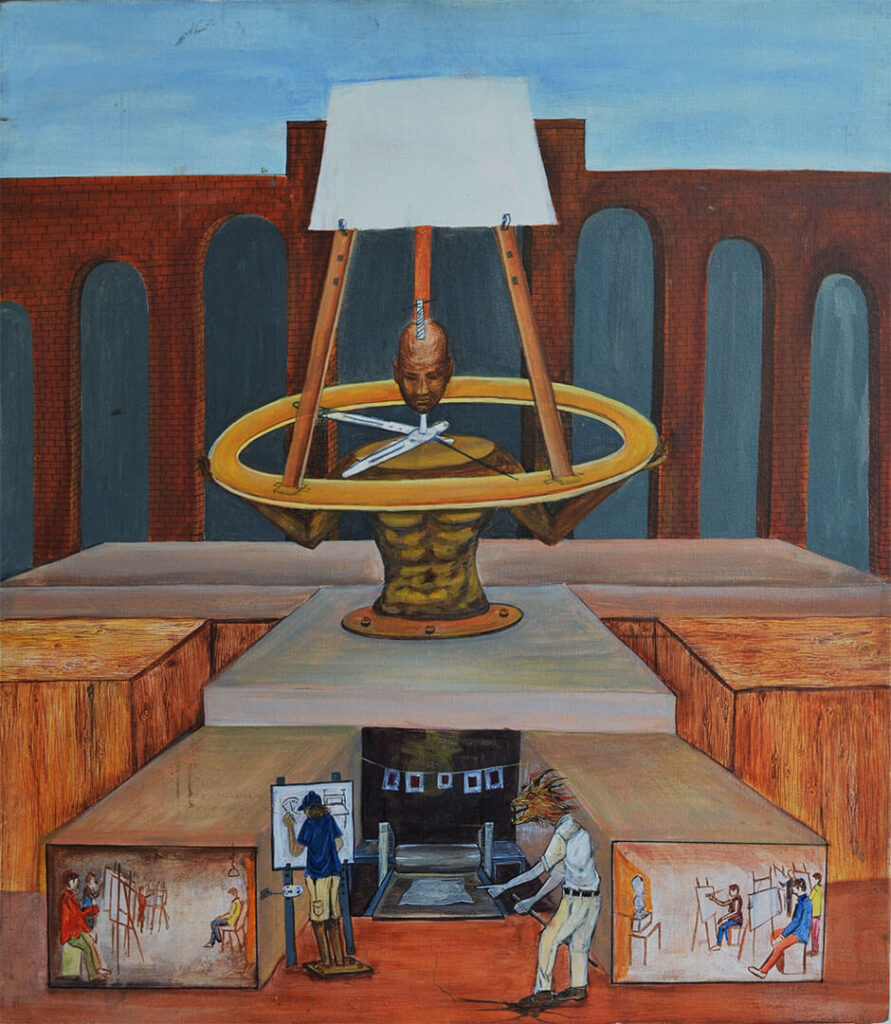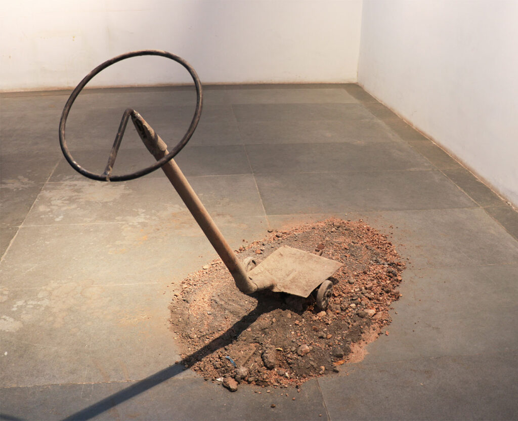 What we use as a baby walker back home is not like the ones I see around in cities, the circular plastic ones in which you place the baby. The design is a simple balanced ‘I’ form with four wheels attached to it. It is made with the lightest kind of wood. The scale in my work is made to look intimidating and far from the daintiness of a baby walker. What I speak of here is not just merely learning how to walk. By walk, I mean the journey of life. The realities and experiences that make a man and help him grow. It symbolises my journey, taking one step each day, building my way up to my dreams. Gaining experiences from various odd jobs, falling and then picking myself up repeatedly.