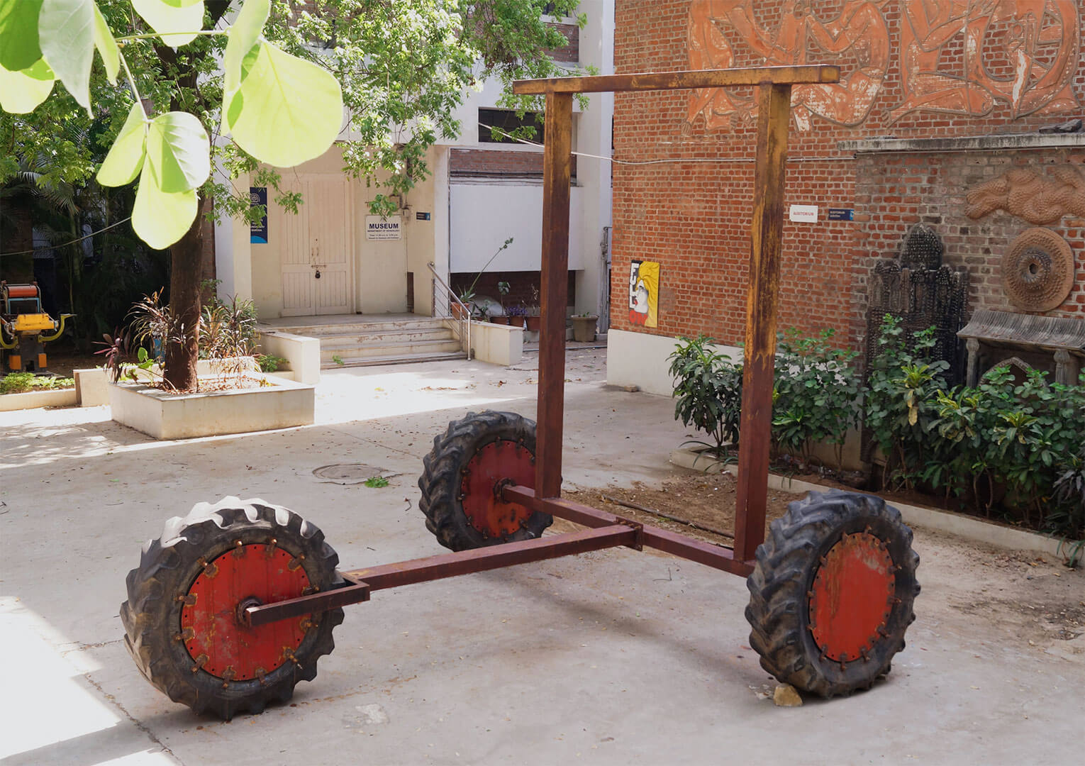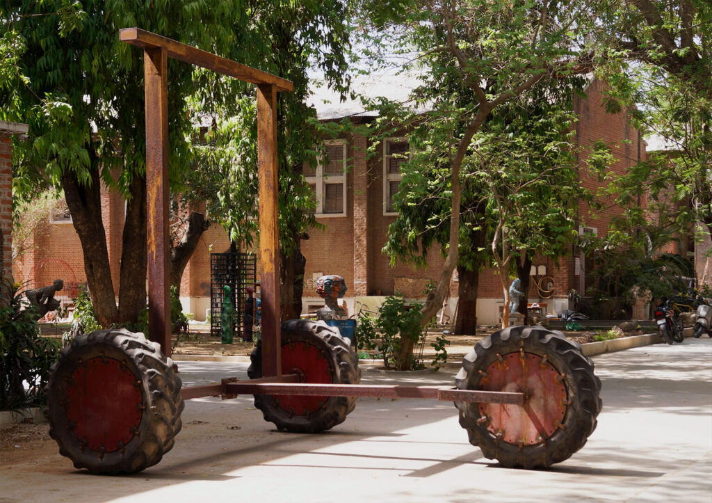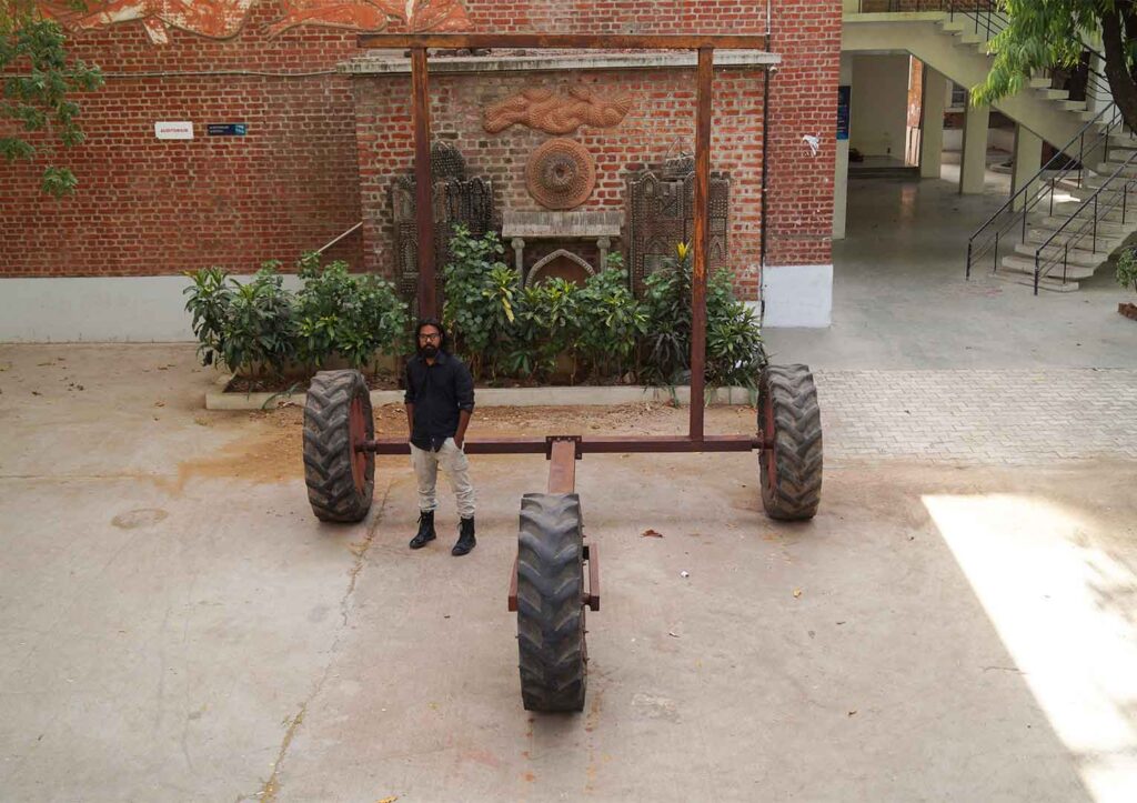 What we use as a baby walker back home is not like the ones I see around in cities, the circular plastic ones in which you place the baby. The design is a simple balanced ‘I’ form with four wheels attached to it. It is made with the lightest kind of wood. The scale in my work is made to look intimidating and far from the daintiness of a baby walker. What I speak of here is not just merely learning how to walk. By walk, I mean the journey of life. The realities and experiences that make a man and help him grow. It symbolises my journey, taking one step each day, building my way up to my dreams. Gaining experiences from various odd jobs, falling and then picking myself up repeatedly.